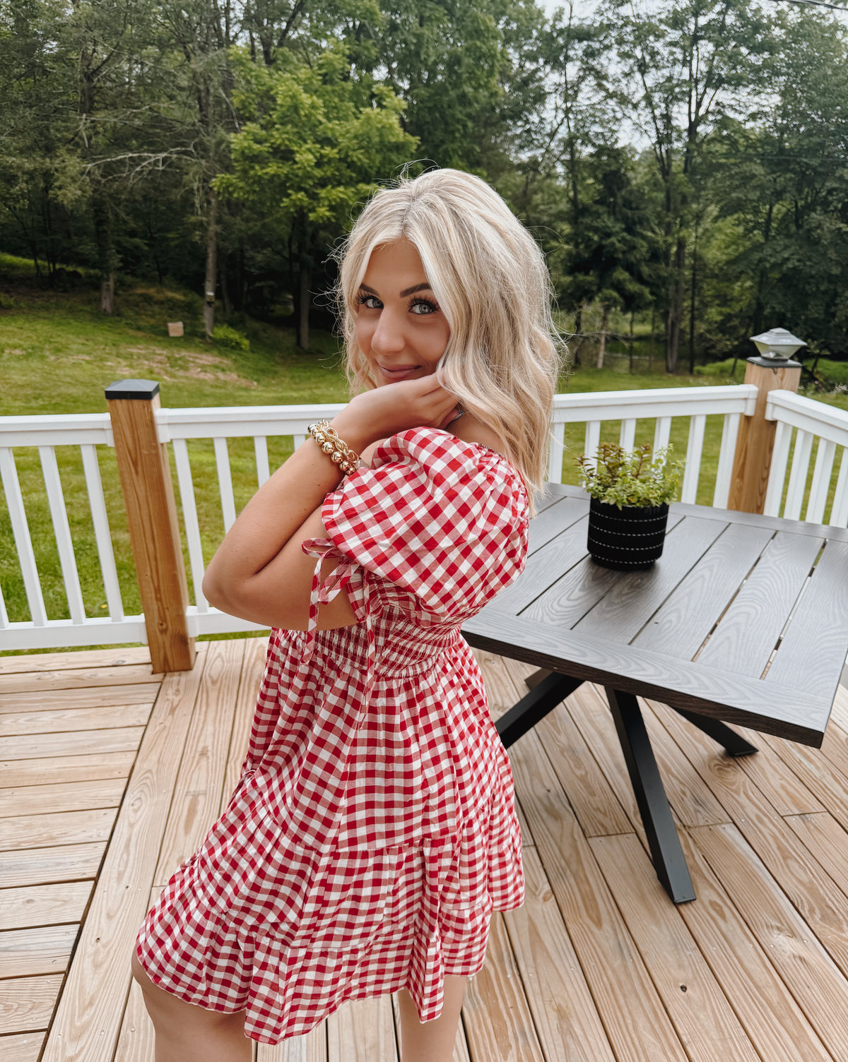 The Gingham Grace Dress combines timeless charm with expert tailoring. Its smocked bodice ensures a comfortable, flattering fit, while the self-tie puff sleeves add a delicate, adjustable detail. The tiered ruffle skirt creates graceful movement and a feminine silhouette, making this dress an elegant choice for both casual and semi-formal occasions. Crafted to balance style and comfort, it’s a versatile addition to any wardrobe.