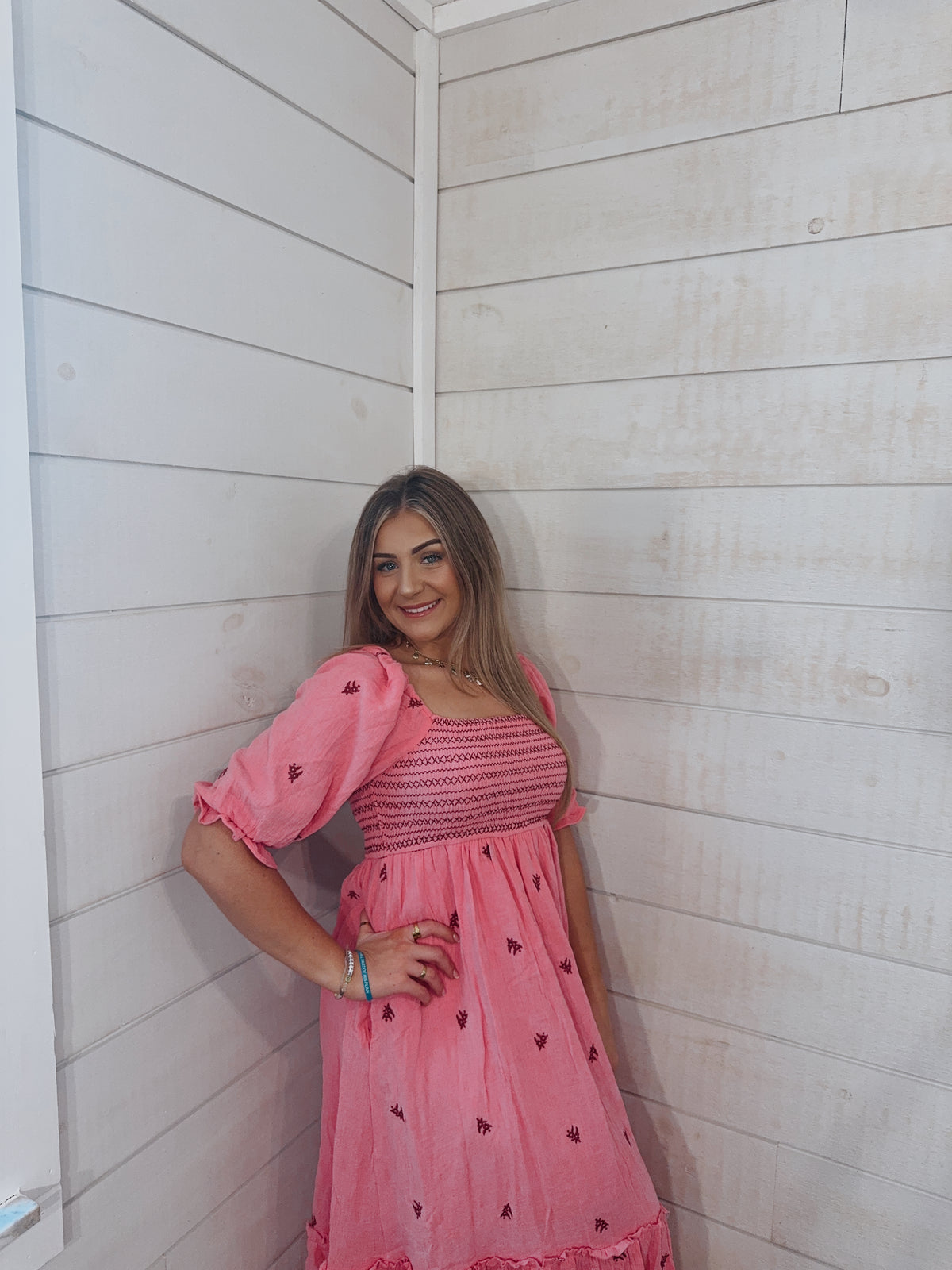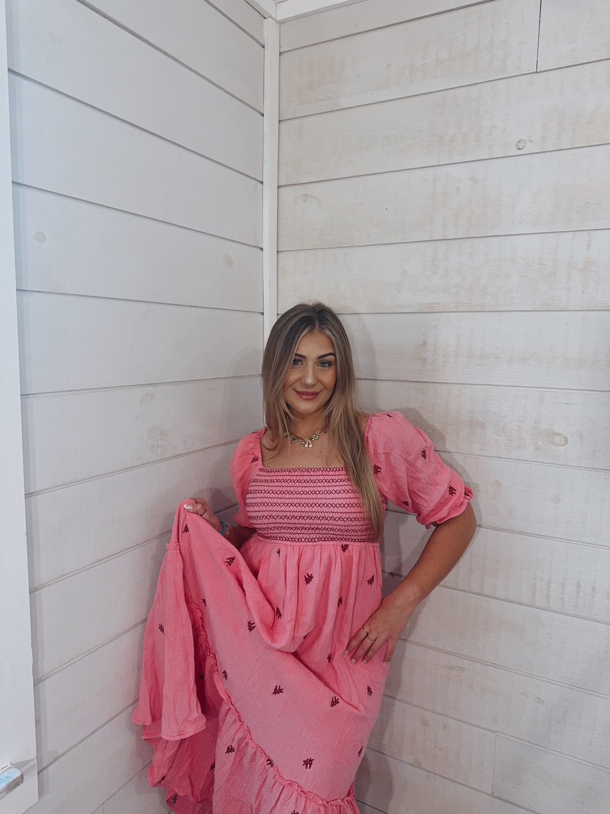 The Blush Bloom Smocked Dress is the perfect addition to your wardrobe. Made from lightweight cotton gauze, this maxi dress features a smocked bodice, elbow length sleeves with ruffled ends, and side pockets for functionality. The ruffled flounce and embroidered floral motif add a touch of elegance. Stay comfortable and stylish with this fully lined dress.