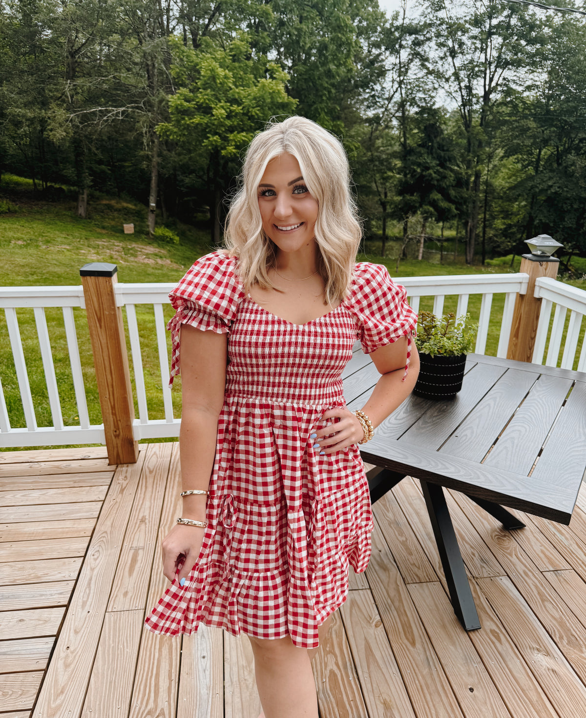 The Gingham Grace Dress combines timeless charm with expert tailoring. Its smocked bodice ensures a comfortable, flattering fit, while the self-tie puff sleeves add a delicate, adjustable detail. The tiered ruffle skirt creates graceful movement and a feminine silhouette, making this dress an elegant choice for both casual and semi-formal occasions. Crafted to balance style and comfort, it’s a versatile addition to any wardrobe.