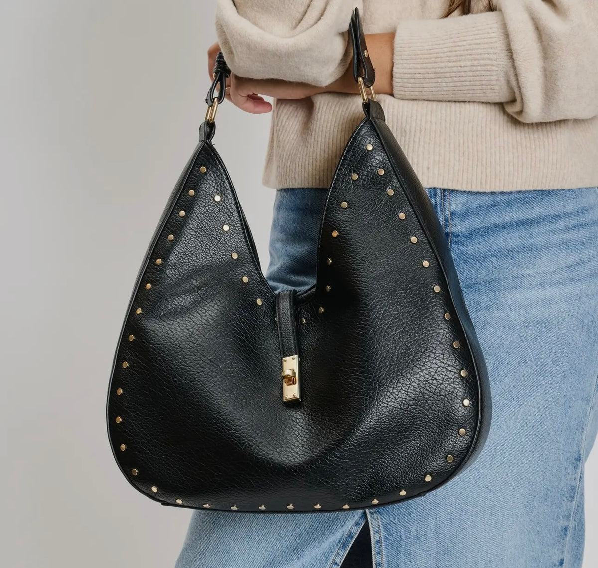 Effortlessly blend edge with elegance with the Olivia Hobo Purse. Crafted from pebbled vegan leather, this hobo bag features stud embellishments and gold hardware for a touch of sophistication. The turn lock loop closure adds extra style, while the printed fabric lining and pockets keep your essentials organized. Upgrade your accessory game with this chic and functional purse.