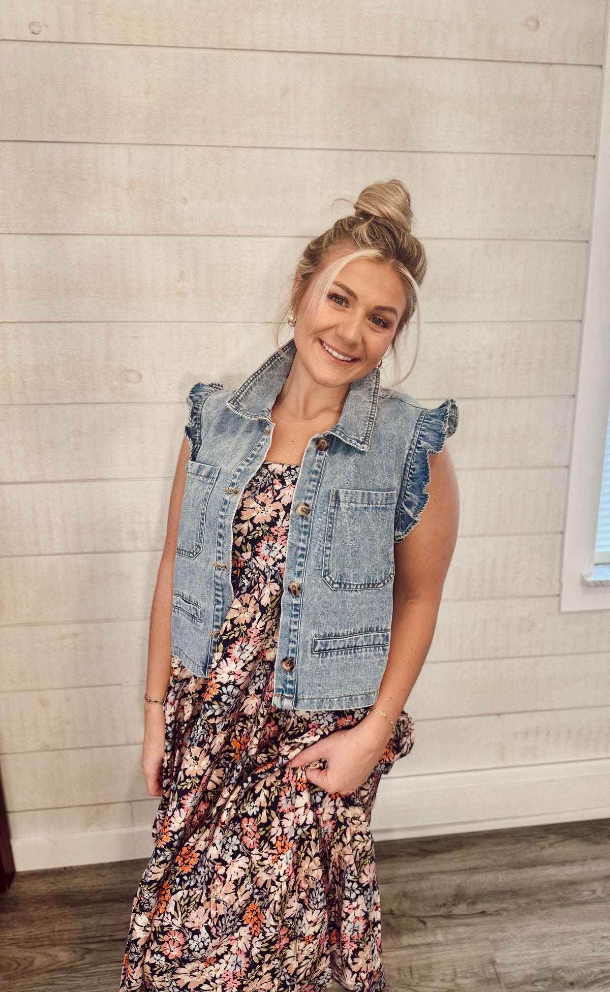 This light washed denim vest features feminine ruffle detailing, adding a touch of style and sophistication to any outfit. Made from high-quality denim, it is both durable and stylish. Perfect for layering over any top, this vest is a versatile and must-have addition to your wardrobe.