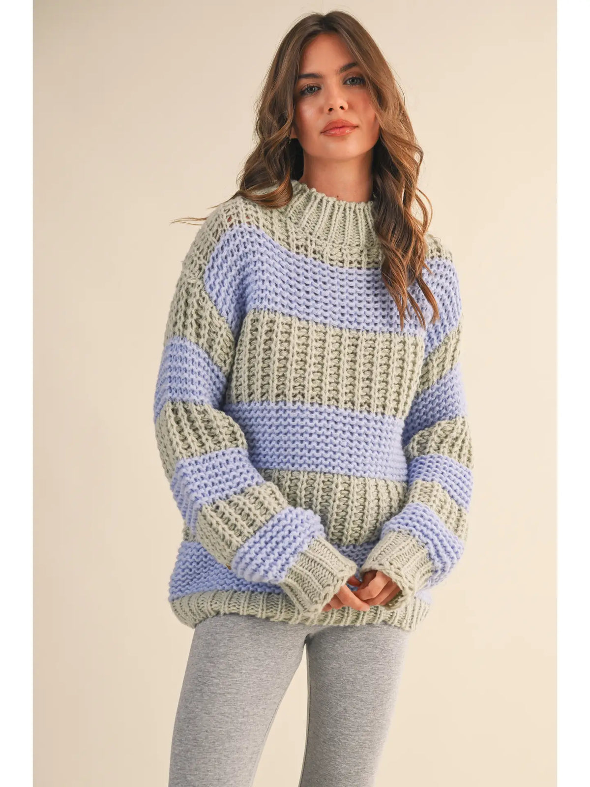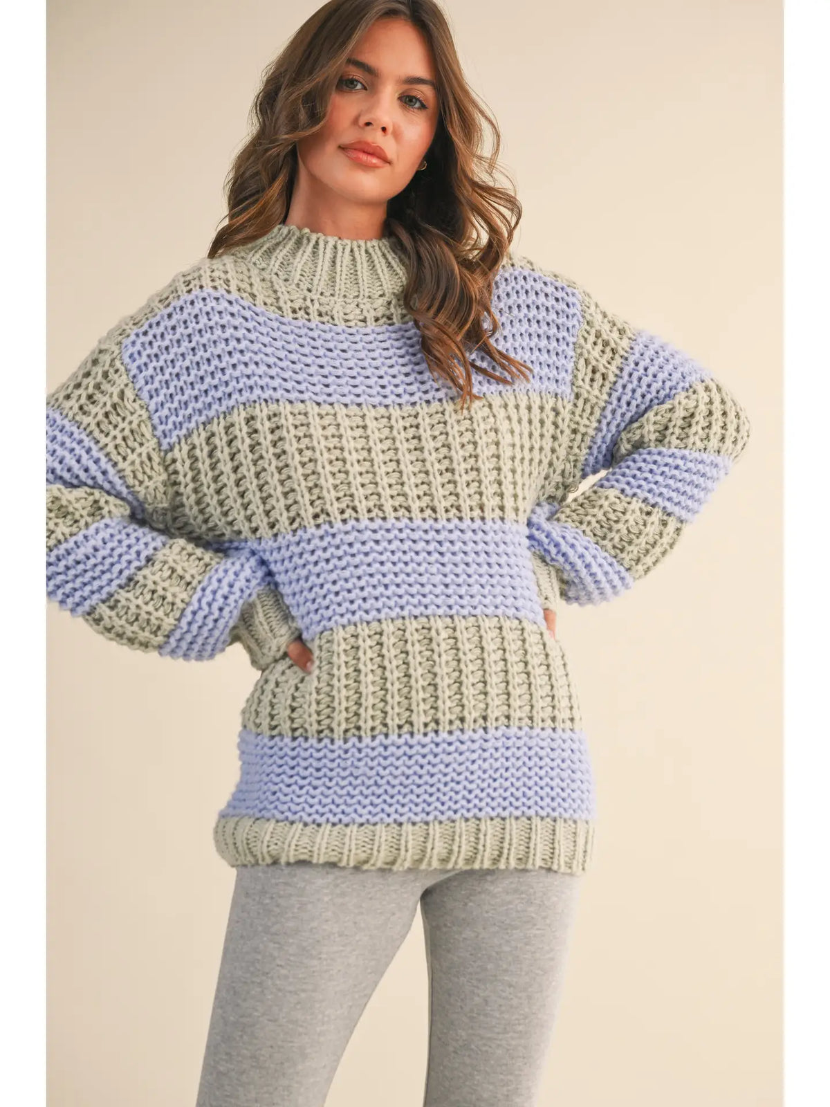 This women's knit sweater features bold striped color blocks, showcasing the brand's innovative fashion-forward vision. The chunky texture adds depth, making it a distinctive piece that easily shifts from relaxed to elegant wear. Combining feminine charm with a subtle edge, this premium-quality sweater remains a standout in the dynamic fashion scene. Experience the unique craftsmanship and style that define Klesis.