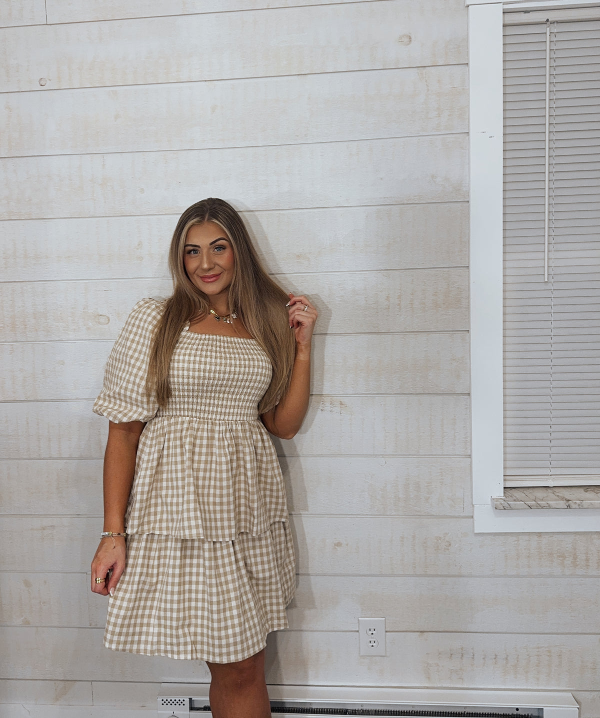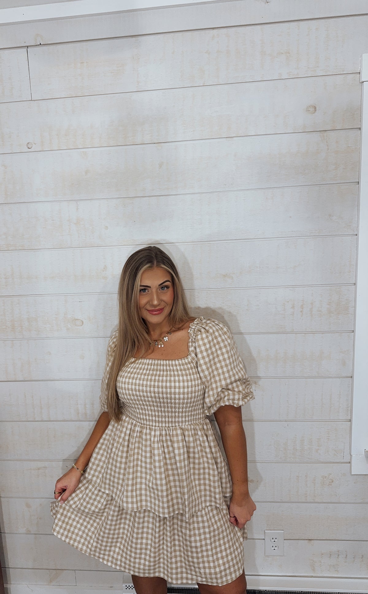 Expertly designed to flatter all body types, The Millie Dress features a tan and neutral gingham print, with puff sleeves and a length that falls a couple inches above the knees. Made from 100% cotton, this dress is both stylish and comfortable. Machine wash cold and hang to dry for easy maintenance.