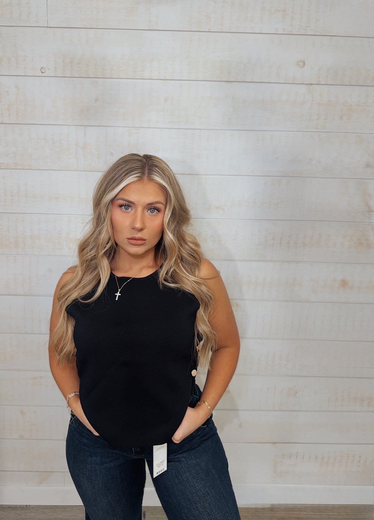 Discover effortless style with our Timeless Charm Tank. This solid sleeveless cropped sweater knit top features a side split hem, adorned with elegant gold buttons. Unlined and lightweight, it's perfect for any occasion. Non-sheer and made with high-quality knit, this tank is a must-have for every fashion-forward wardrobe.