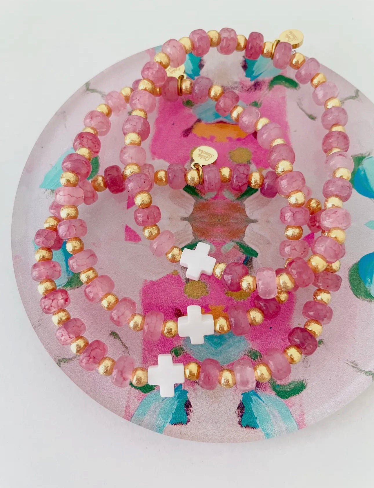 This elegant pink cross bracelet is the perfect addition to any outfit. With small gemstone beads, it adds a touch of sophistication while showcasing your faith. Elevate your style and share your beliefs with this beautifully crafted bracelet.