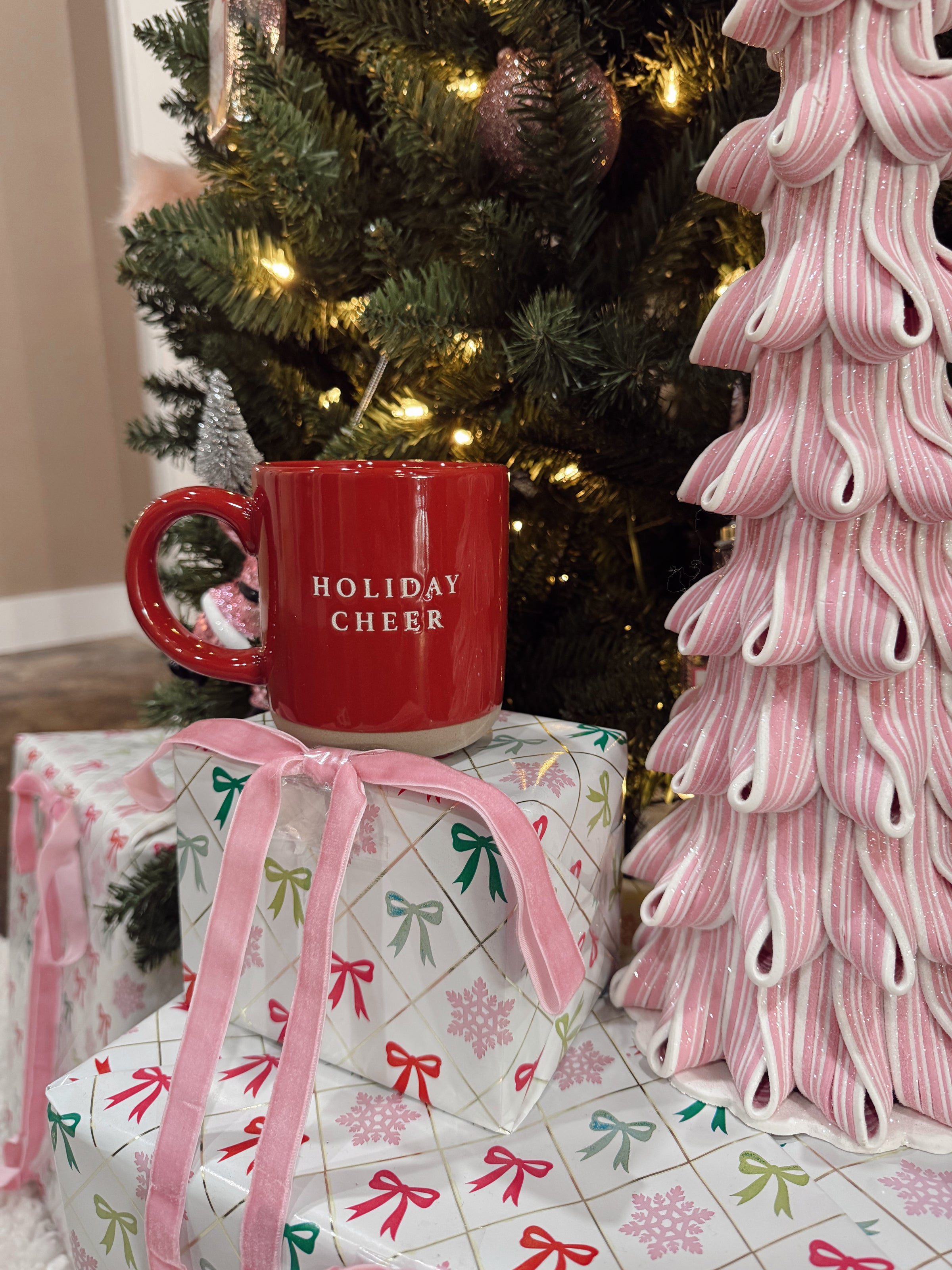 The Happy Holidays Stoneware Mug features a 14oz capacity with a charming speckled brown finish and white gingerbread designs on both sides. Measuring 3.31 x 3.93 inches (5.19 inches including handle), each hand-crafted mug boasts unique natural bottom details. Designed in the USA and imported, it is microwave and dishwasher safe for easy daily use. To maintain its quality, wash before first use and avoid abrasive cleaners. This mug adds warmth and style to your coffee or tea experience, combining functionality with festive elegance.