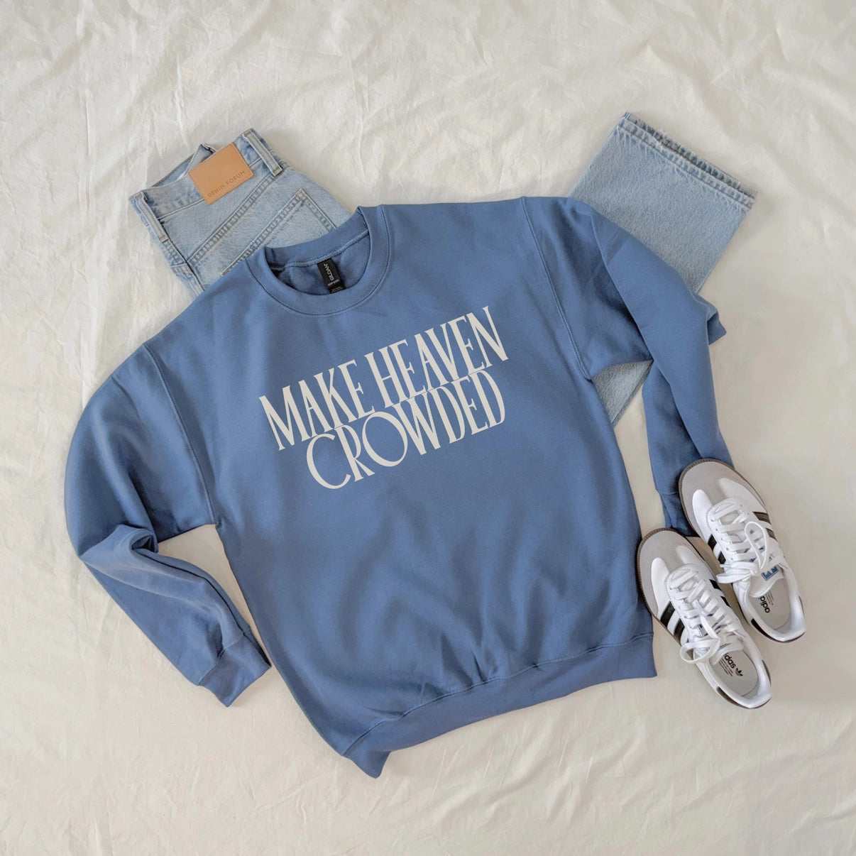 Elevate your casual wardrobe with the Make Heaven Crowded Sweatshirt, designed to inspire positivity and faith effortlessly. Crafted from a soft cotton blend, it offers lasting comfort for daily wear. Its unisex crewneck silhouette complements a variety of outfits, from jeans to leggings, making it versatile for any occasion. Whether you're attending a church service, meeting friends, or enjoying downtime, this sweatshirt carries a powerful message with style and ease.